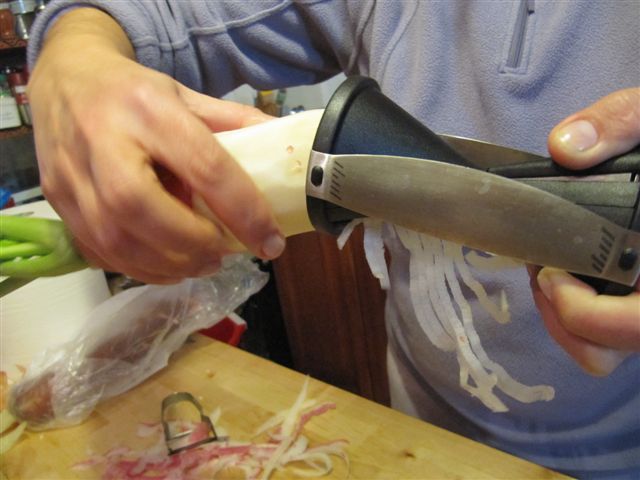 He expuesto dos utensilios polivalentes, pero también me seducen otros como el, para mí, muy socorrido laminador de aguacate que permite sacar de la cáscara la carne del fruto al tiempo que la corta en 5 rodajas. También un sacapuntas que te permite hacer tallarines de dos grosores a partir de hortalizas gruesas, como zanahorias, calabacines o rábanos tanto para ensaladas como para sopas.