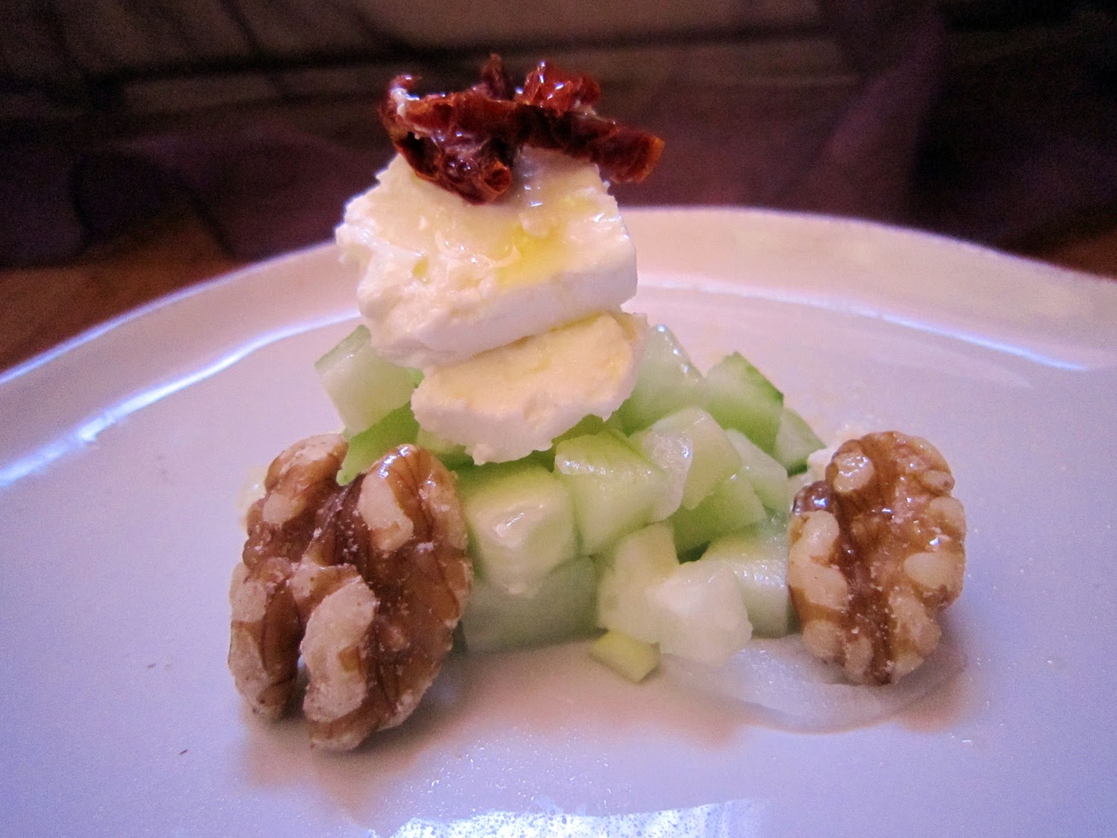 Cortar a daditos el pepino, picar fino la cebolleta y poner en remojo en agua fría, contra más tiempo lo dejemos más terso quedará el pepino. Escurrir bien y poner en la ensaladera. . Aliñamos con ralladura de la piel del medio limón y su zumo, el cilantro picado, aceite de argán y sal. Añadir el tomate seco cortado a tiras finas, las nueces picadas y el queso feta desmenuzado.