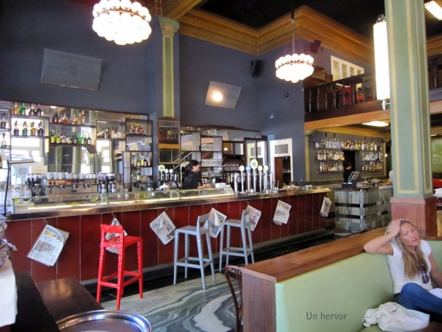 Pues bien, una vez allí, fue como dar un salto al pasado –yo que soy de Palma, fue como volver a la época en que el bar Niza o el bar Cristal de la Plaza España eran lo más- pero sin artificios: grandes espejos tras las botellas sobre estantes de cristal, sofás corridos tapizados en skay nada kitch. Porque estoy cansada de las cafeterías de aire retro a base de fornituras de madera y mesas de hierro colado y mármol.
