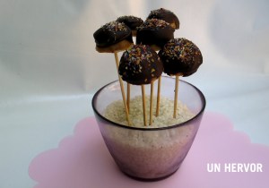 Ayudada por el palito, bañamos la bolita de micuit en función de la cantidad de cobertura que queramos o, incluso el acabado que queramos dar al chupachup: con una pequeña puntita, metiendo en línea recta; con una trama horizontal si, al bañar, giramos el bombón sobre sí mismo… Ha de ser una operación rápida y suave, evitando hacer un efecto cuchara que resultaría en un exceso de chocolate.