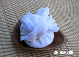 Disponemos una gasa o tela de algodón limpia sobre un colador apoyado en un recipiente y vertemos la leche. Juntamos las esquinas de la tela y anudamos formando un paquete prieto para que expulse el agüilla. Lo dejamos drenar durante, al menos dos horas.