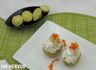Rellenamos –más bien coronamos- cada patata de forma bien generosa y rematamos con las huevas de capelán.