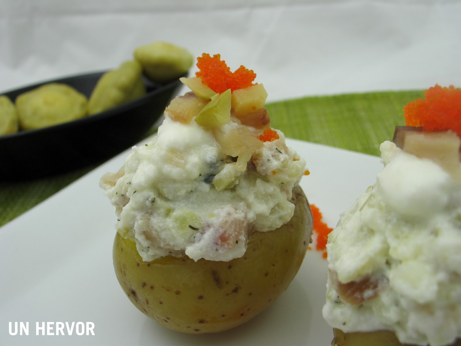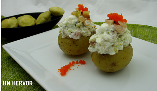 Rellenamos –más bien coronamos- cada patata de forma bien generosa y rematamos con las huevas de capelán.