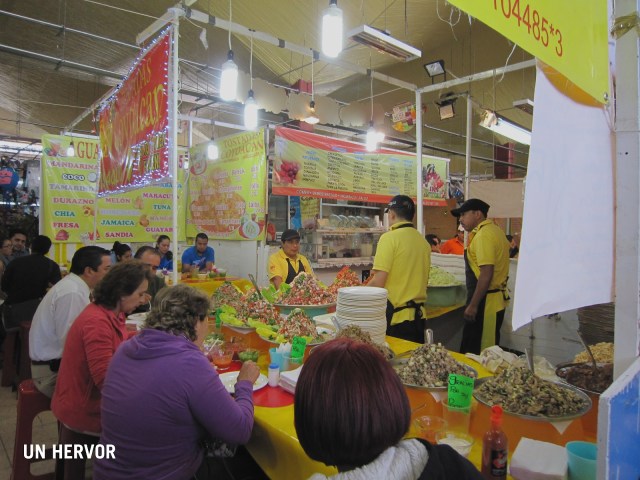 Calderos de barro donde se mantienen calientes guisados, coloridos y picados en menudo ceviches, así como planchas repletas de tortillas y tortas tentaban a la vista y al estómago, aún recién desayunados. Los locales recomiendan las quesadillas de doña Luche.