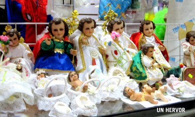 Más allá, abigarrados puestos repletos de niños Dios y todos los complementos imaginables para vestirlos con todas sus galas el día de la Candelaria, cuando el que fue afortunado con el haba del roscón de Reyes deberá hacer los tamales.