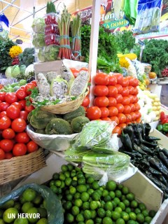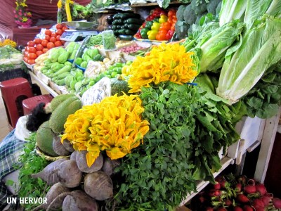 Flores de calabacín, nopales (hojas tiernas de chumbera), patatitas para guisar -que una se moría por arrugar con un buen mojo…), chayotes -un curioso calabacín- atraen la vista, aunque mucho más sorprendente es pasar por los puestos de comida donde sentarse a tomar un tentempié.