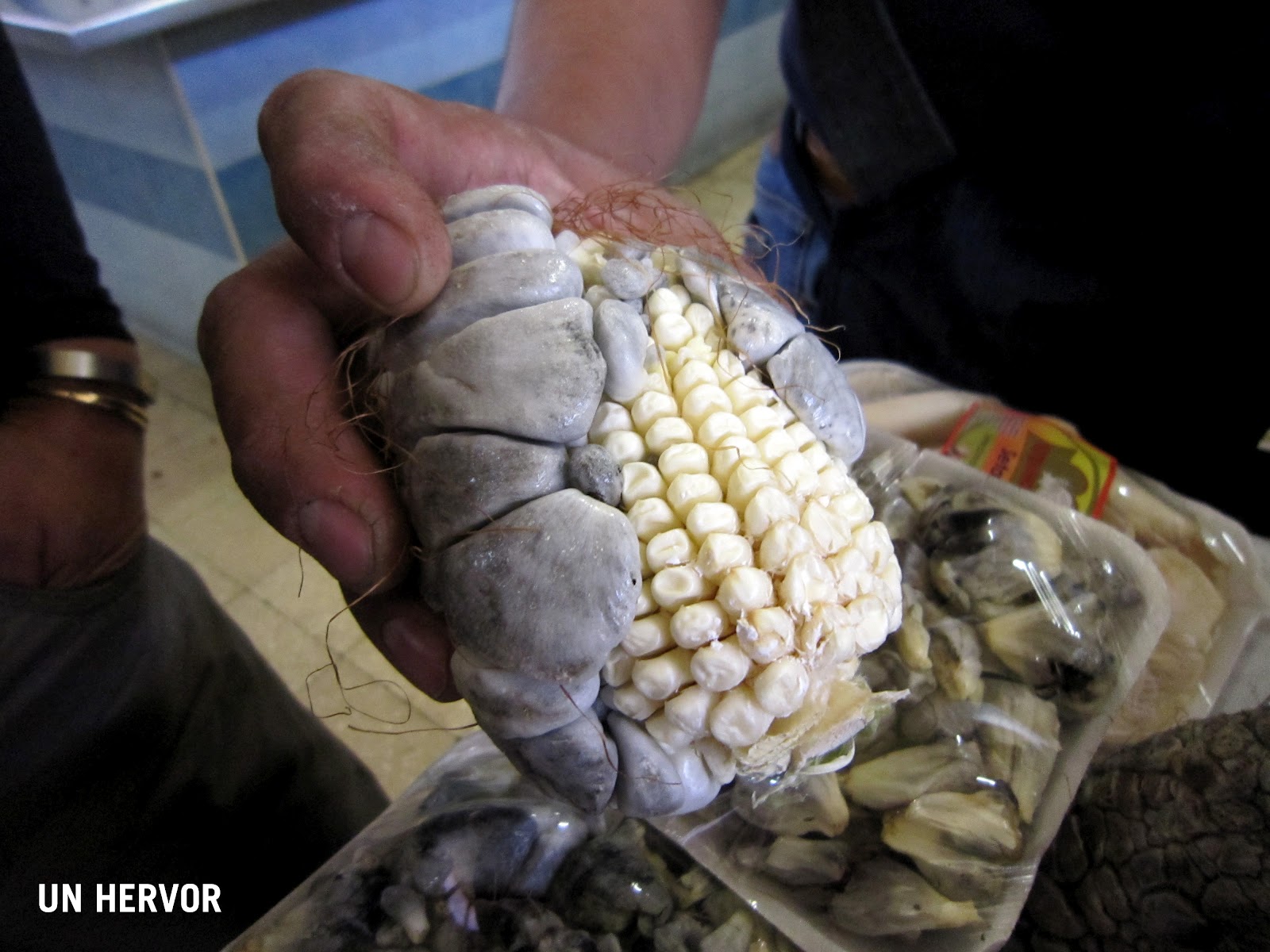 La ventaja de visitar una ciudad como México DF y contar con un cicerone, es que un día te acompañan a un mercado, como el de Coyoacán, y los fríes a preguntas sin compasión hasta que descubres que no, no es maíz malva, sino un hongo que afecta al maíz, el huitlacoche, que cocinado se vuelve de un pardo que asusta, de sabor contundente al principio, que casa muy bien en una quesadilla con queso. Así que doy gracias a Marcela por su tremenda paciencia.