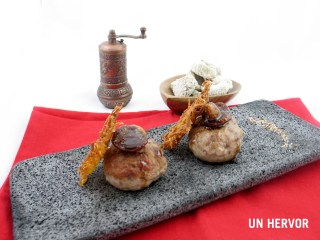 Introducimos un trozo de foie en cada bola y estiramos la carne de los lados hasta que cubrir por completo el corazón. Achatamos un poco.