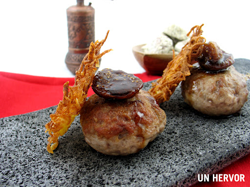 Introducimos un trozo de foie en cada bola y estiramos la carne de los lados hasta que cubrir por completo el corazón. Achatamos un poco.