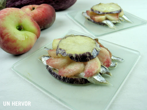 En un plato colocamos la rodaja de berenjena más grande y, sobre ella colocamos 5 filetes de boquerón, uno junto al otro.