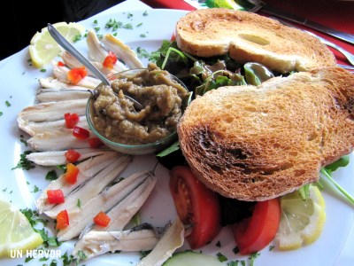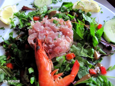 La carta, sin ser muy larga, da cabida desde un “gazpacho maison” o un “assiette catalán” –pan tostado con tomate, jamón y queso manchego- a un entrecote o pescado para los que no se quieren arriesgar, a otras cositas como las que pedimos: un tartár de albacora, una ensalada mediterránea a base de berenjena asada y anchoas de Colliure –gran chasco, porque son como nuestros boquerones-  o un coquillage -¿conchada?- que llevaba ostras, mejillones, bulots y langostinos.