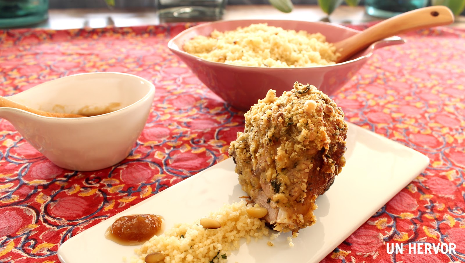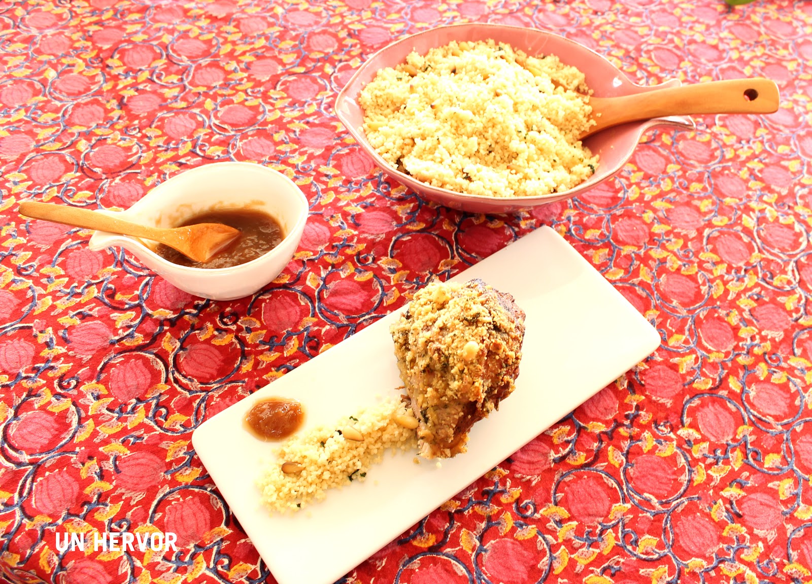 Servimos nada más sacar el cordero del horno con la mermelada de ruibarbo y, cómo no, con un cuscús al que tan solo habremos añadido hojitas de menta picada, unos piñones tostados, sal y un poco de aceite o de mantequilla.