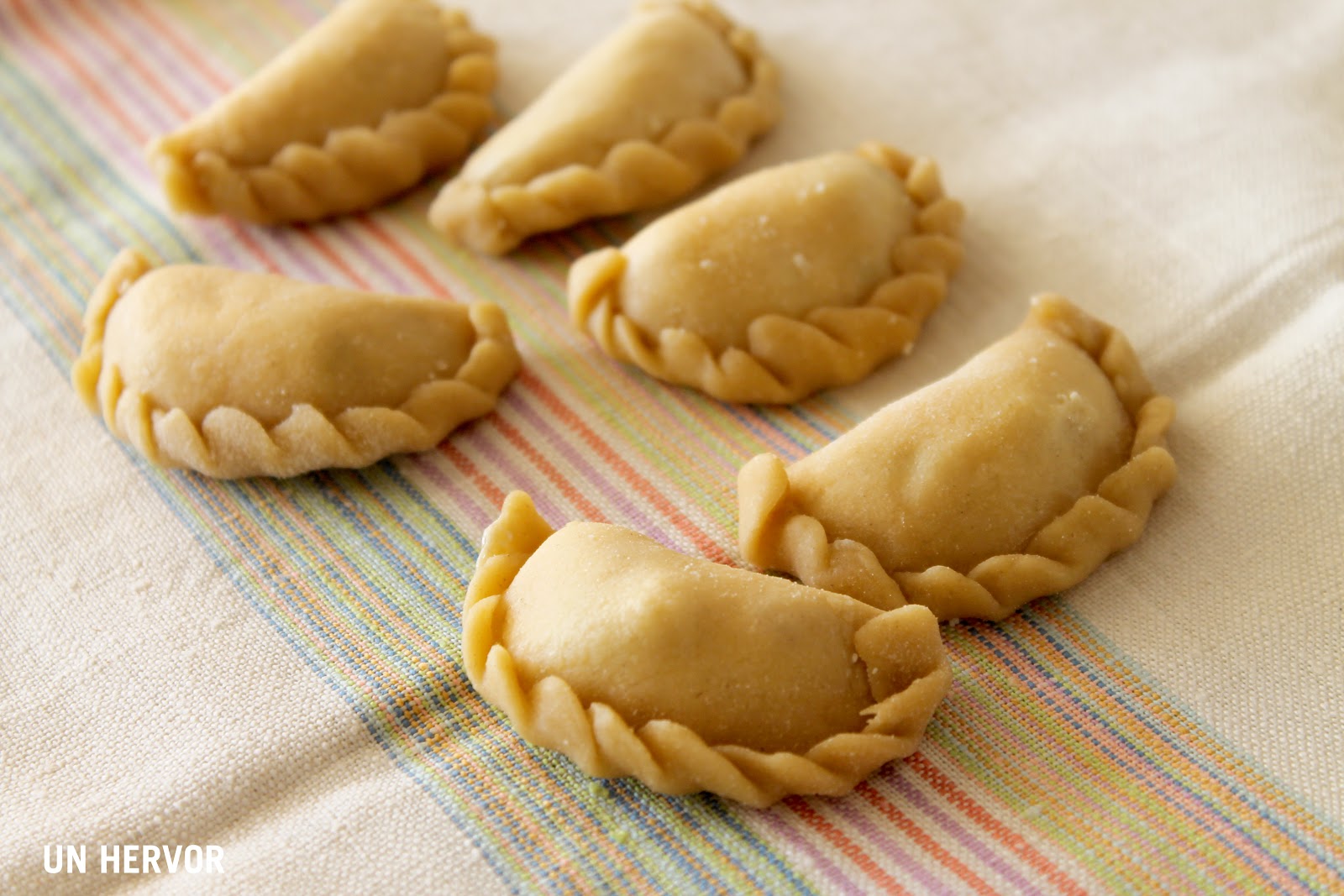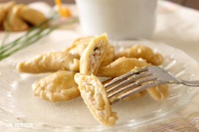 Con un cortapastas redondo, según el tamaño que deseemos –yo utilicé uno de 6 cm, pues un tamaño menor tampoco aporta gran diferencia más allá de alargar la faena-, cortamos un aro, disponemos en el centro una cucharadita (de postre) rasa de la mezcla de requesón. Doblamos el aro haciendo coincidir los extremos y sellamos sobre la mesa de trabajo apretando con la yema del dedo. Para hacer el cierre encadenado, sosteniendo la empanadilla con una mano, pellizcaremos primero y doblaremos al bies hacia adentro. Volvemos a pellizcar a ras del doblez anterior y volvemos a doblar al bies y así hasta completar todo el borde del cialzion.