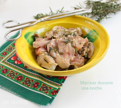 Disponemos el conejo en un lebrillo. Lavamos las ramitas de romero, arrancamos las hojitas y las picamos bien en con la ayuda del robot, bien con el mortero o a cuchillo, junto a las alcaparras y el diente de ajo pelado. No ha de ser un picadillo fino, sino basto más bien basto. Salpimentamos al gusto y, por último regamos con el zumo de la naranja. Mezclamos bien, tapamos con papel film y dejamos marinar durante una noche.