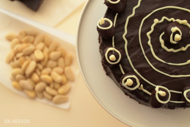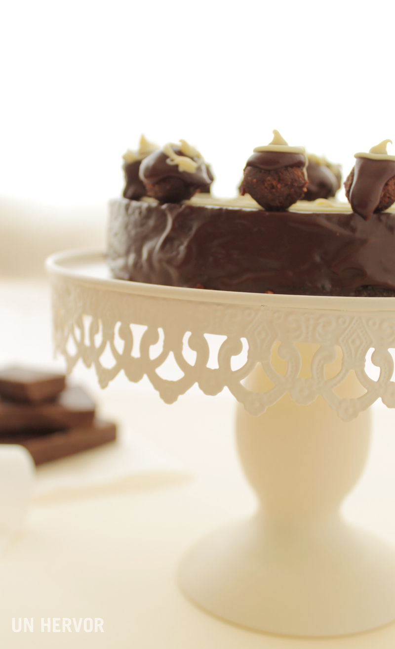 Cuando la cobertura de chocolate esté tibia, con el mismo cazo, la dejamos caer sobre el centro de la tarta hasta que vaya cayendo por los extremos.