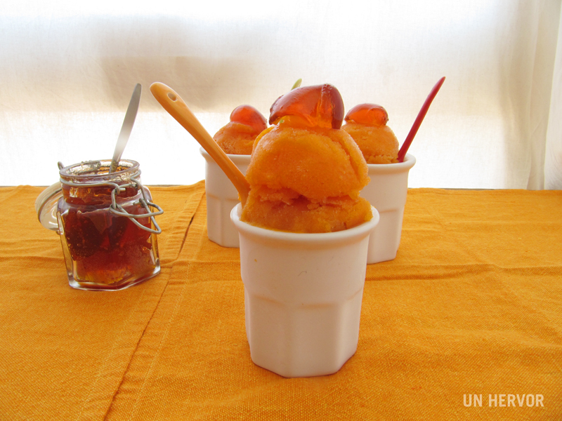 Los que ya me vais conociendo sabréis que a mí no me gusta tirar nada cuando hablamos de comida, por lo que con la pulpa acabé haciendo un sorbete que he de añadir, hace buena pareja con la jalea.