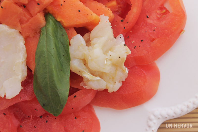 Lavamos las hojas de albahaca fresca, las escurrimos bien y las cortamos a tiritas finas y las añadimos justo antes que el bacalao marinado sobre las rodajas de tomate y papaya.