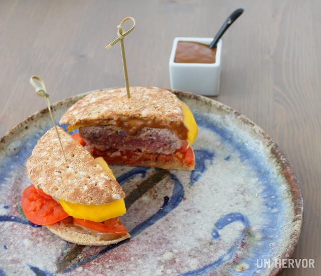 Sobre la base del panecillo colocamos un poco de la salsa de soja y yogur y el tomate a rodajas. Encima colocaremos la hamburguesa, sobre la que irá el mango y una buena cucharada de salsa, la cual tendremos a mano porque es altamente adictiva.
