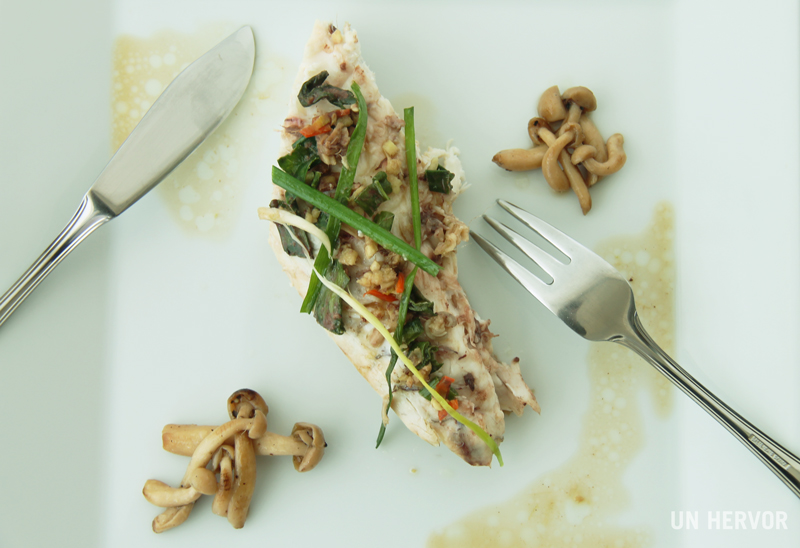 Colocamos la lubina en la fuente donde la vayamos a servir y colocamos sobre ella las ramitas de cebollino, lo que nos ha sobrado del ajo tierno y de la cebolleta.
